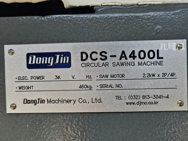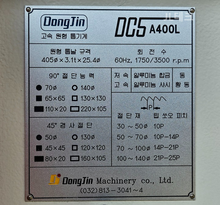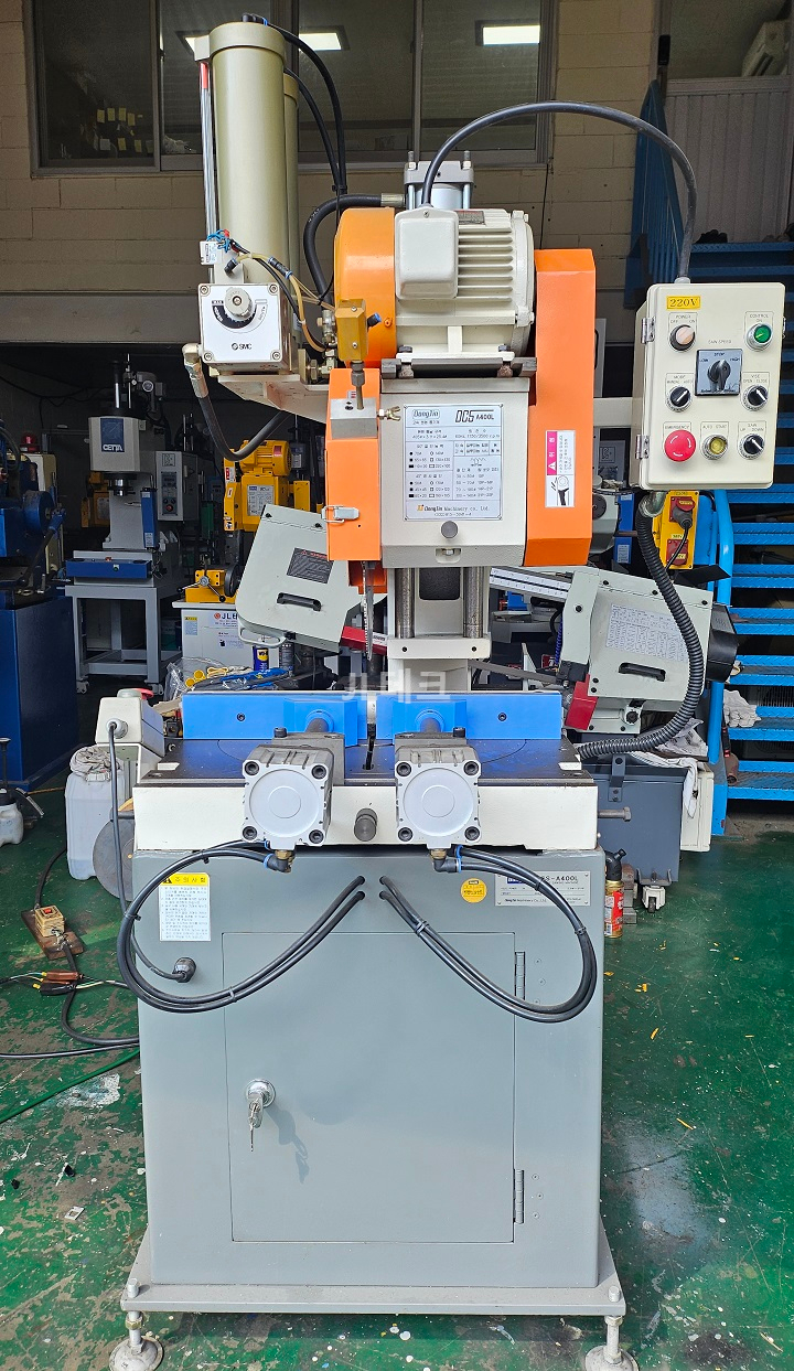 모델명 : DCS-A400L 제조사: 동진기계 구동방식 : 공압반자동 톱날구동모터 : 2.2kw 3상 220V 60Hz 2/4P 톱날규격 : 405Øx3.1t×25.4Ø 회전수 : 1750/3500 r.p.m 절단: Ø140mm 기계중량 : 460kg 기계치수 : 720x1132x1772mm